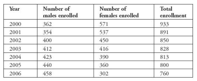 Official ExplanationConveniently, the numbers are already in (decreasing) numerical order, making it easy to compute the median. The median annual total enrollment through 2006 is simply 828, the number in the middle. If the new value, the 2007 total enrollment, were less than 828, the median would go down and would not equal 834.5, as required. If the 2007 total were more than 850, then the median for the 8 years would be the average of the two middle values, and again would not equal 834.5. Therefore, the 2007 total enrollment, say x, must have been between 828 and 850, and more importantly, when x is averaged with 828, the result is the median for all 8 years, 834.5.