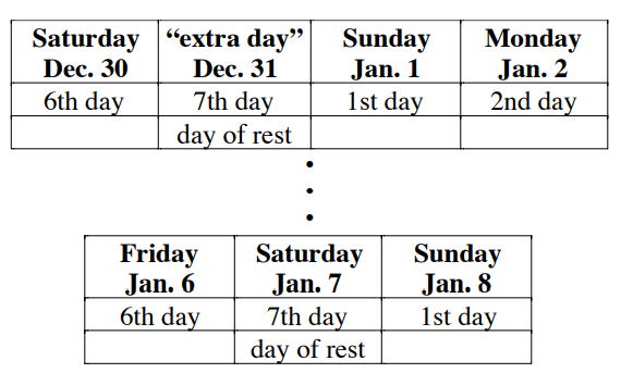 (B) Yes. Let’s consider the first year the new calendar is implemented. January 1 falls on a Sunday and is a day of rest. The year progresses until Saturday, December 30, with the people in this answer-choice having rested every seventh day, on Sunday. The next day, December 31, would be a day of rest; but because it is the last day of the year, it does not belong to a week and would not be labeled Sunday. Seven days later, the next day of rest falls on Saturday. In the second year the day of rest would always be Saturday. In the third year the day of rest would always fall on a Friday. The following calendar illustrates the situation at the end of the first year: