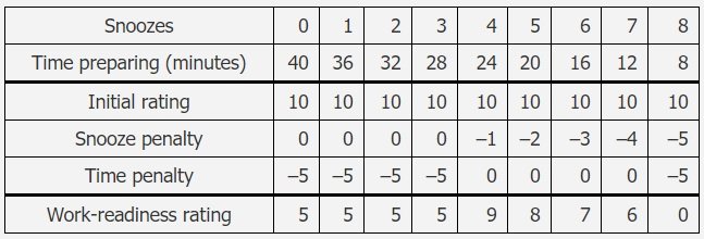 If Javier spends more than 25 mins or less than 10 mins to prepare, his rating is reduced by 5 points. To sleep past 6am, however, Javier must use the snooze button on his alarm clock, which delays the alarm by 4 mins. Each press of the snooze button after the third will decrease Javier's efficiency rating by 1 point.