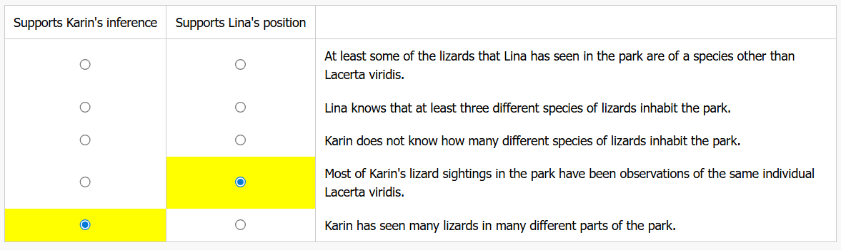Select for Supports Karin's inference the statement that, if true, most strongly supports the inference that Karin draws, and select for Supports Lina's position the statement that, if true, most strongly supports the position that Lina expresses. Make only two selections, one in each column.