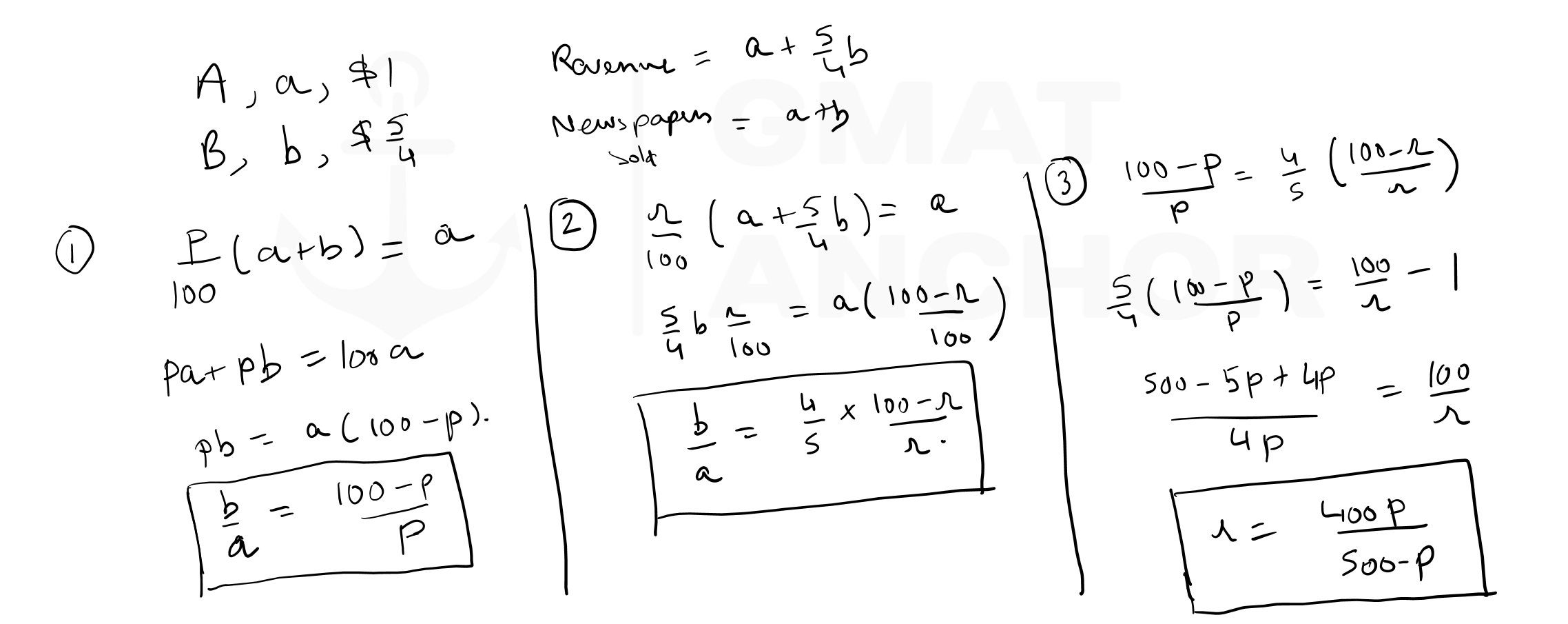 \(r=\frac{a}{a + 1.25*\frac{a(100-p)}{p}}*100\) --> reduce by \(a\) and simplify --> \(r=\frac{100p}{p+125-1.25p}=\frac{100p}{125-0.25p}\)