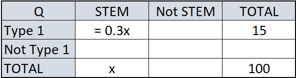 Last year in Country X, 15% of all students who received an undergraduate degree received their degree from a Type 1 university, while 30% of all students who received an undergraduate degree in a STEM (science, technology, engineering, or mathematics) major received their degree from a Type 1 university. Last year in Country X, what percent of all students who received an undergraduate degree from a Type 1 university received an undergraduate degree in a STEM major?