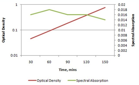 Lenses used in outer space video recording devices obviously require superior optical, thermal and barometric characteristics. In 2011, researchers at NASA synthesized a polymer, X21F702089 (Optical density = 0.02, Spectral absorption = 0.012) which is currently being used in all the recording equipment in their Curiosity space shuttle. Although the polymer performs flawlessly on Earth and in space (its optical density and spectral absorption remain constant), recent images of Mars captured by Curiosity suggest that, on Mars, X21F702Q89 has not been functioning the way it was supposed to This led to a battery of tests being conducted on X21F702089 in simulated Mars-like conditions. The research team for these experiments is led by Dr. Sy Fields, a nobel-prize winning Materials Science engineer. The tests continued until the polymer reached its maximum optical density. This is a portion of a graph (submitted by Dr. Fields' team) showing the variation of optical density and spectral density of X21F702089 with time spent in a Mars-like environment.