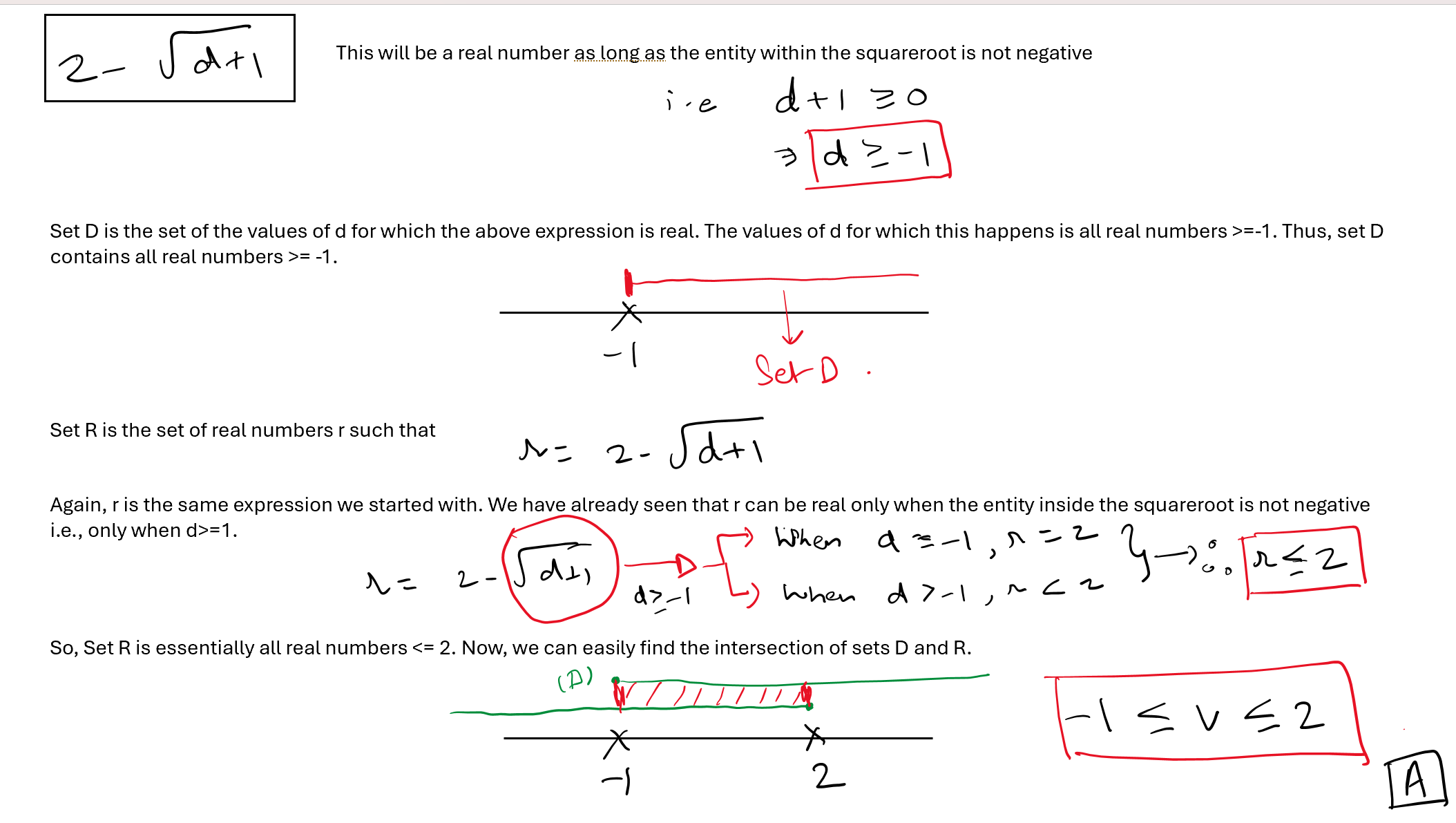 D. So, d in that expression is from D above (\(d \geq -1\)), which makes \(\sqrt{d+1}\) defined. In this case, since the square root cannot give negative result, r would equal to 2 - (some non-negative value), which would make \(r \leq 2\) So, R consist of all number show in green below: