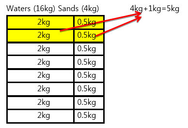 If the mixture comprised of water and sand weighs 20kg in total and the ratio of water to sand is \(8:2\), there should be 16kg of water and 4 kg of sand as shown in the diagram below. However, in order for the ratio to be changed to \(6:4\), 4kg of water shaded should be taken out, but since the mixture is mixed evenly, \(0.5kg+0.5kg = 1kg\) of sand is also taken out at the same time.