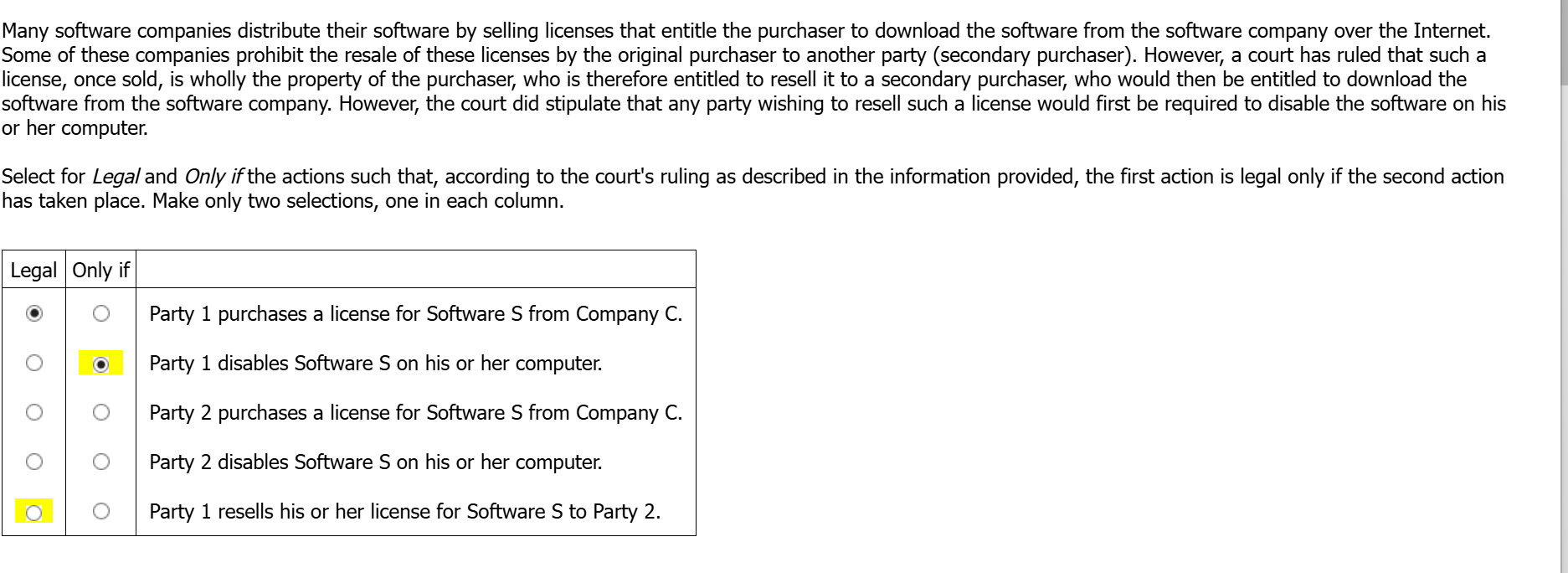 This choice may be correct for Only if since the court ruled that "any party wishing to resell such a license would first be required to disable the software on his or her computer."