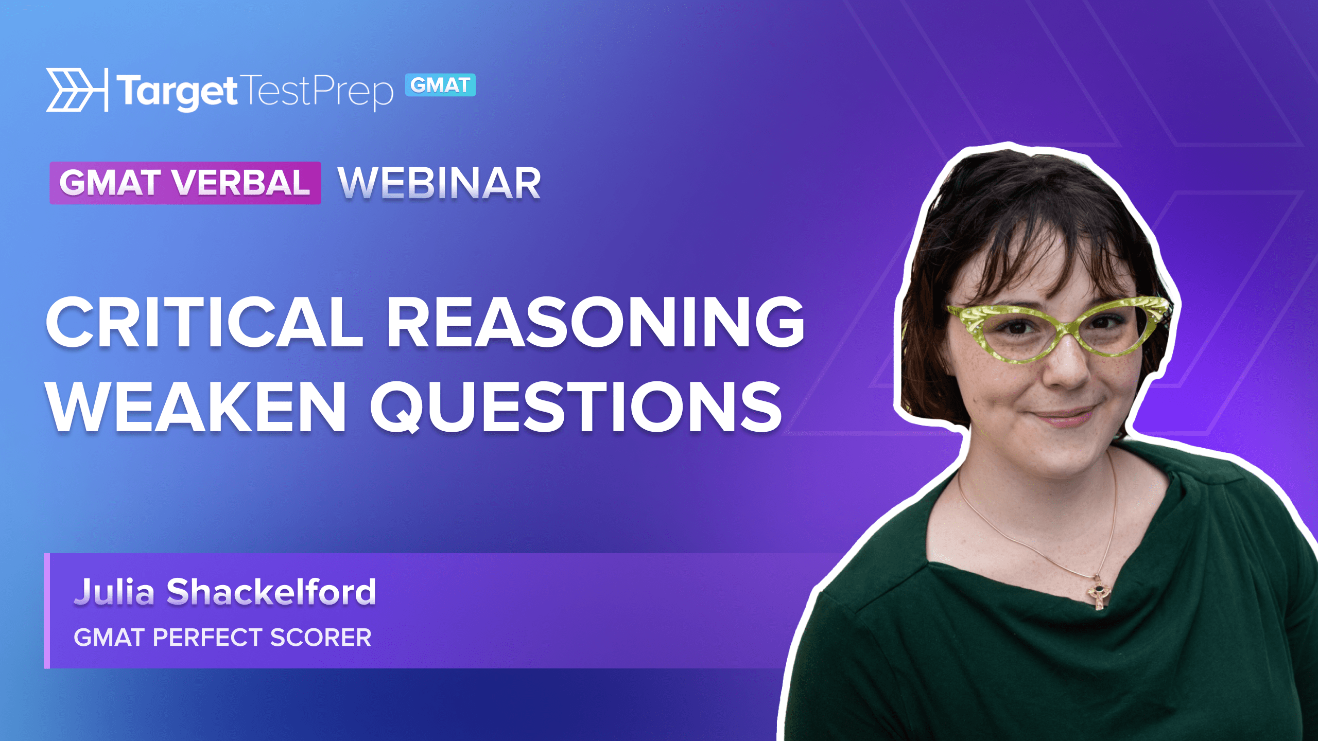 In this webinar, GMAT perfect scorer Julia dives deep into Weaken questions—one of the trickiest parts of Critical Reasoning. She shares actionable tips, proven strategies, and insights from her own prep to help you get faster at solving these questions.