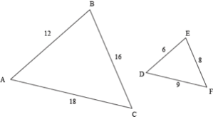 • In similar triangles, the sides of the triangles are in some proportion to one another. For example, a triangle with lengths 3, 4, and 5 has the same angle measures as a triangle with lengths 6, 8, and 10. The two triangles are similar, and all of the sides of the larger triangle are twice the size of the corresponding legs on the smaller triangle.
