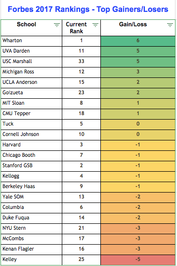 | School | BW’17 | Forbes’17 (Only 2yr MBA programs) | FT’18 | Economist’17 | Country |