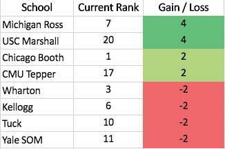 | Top 11-30 | Yale SOM (Acceptance Rate 17%; Category Average 30%) | Cornell ($126K); Darden ($125K); Fuqua ($123K); Category Average ($115K) | Foster (98%); Olin (97%); Carey and Carlson (96%); Category Average (92%) | Yale SOM (727); UCLA (715); Stern (714); Category Average (697) |