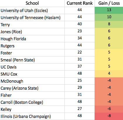 | Top 31 - 60 | Hough Florida (Acceptance Rate 15%; Category Average 39%) | Mendoza ($107K); Mays ($106K); Smeal ($105K); Category Average ($94K) | Fisher and Simon (94%); Terry and Hankamer (93%); Category Average (88%) | Hough (682); Questrom and Marriott (680); Category Average (653) |