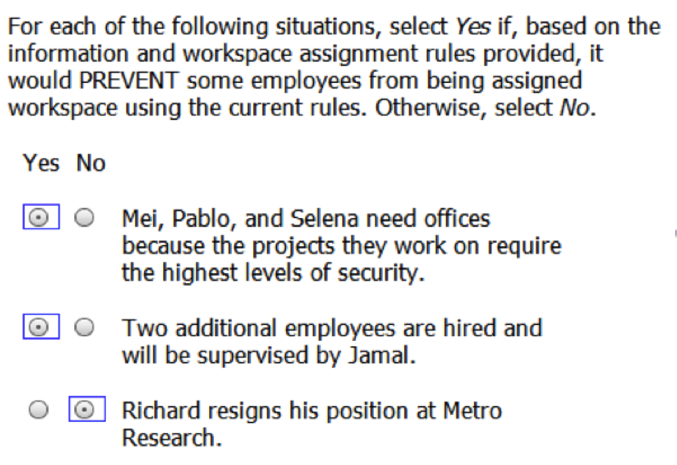 | Mei, Pablo, and Selena need offices because the projects they work on require the highest levels of security. | ||