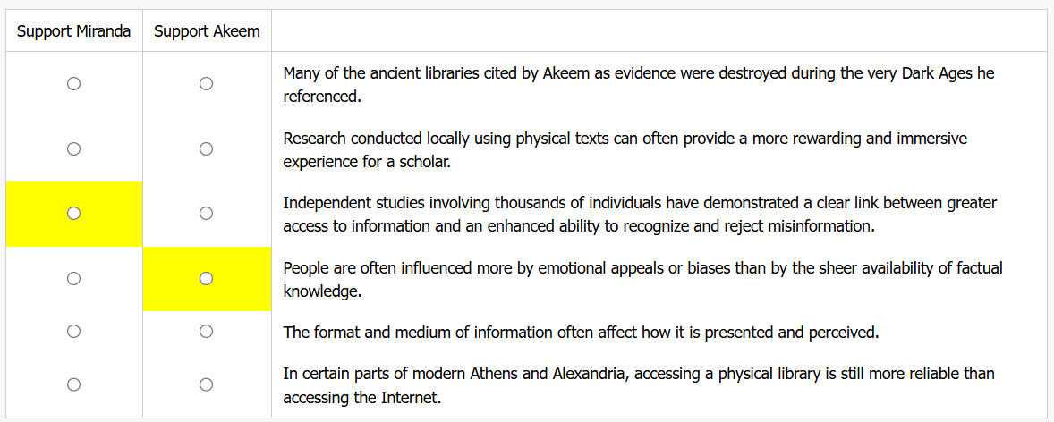 Support Akeem a statement that would support Akeem’s initial rebuttal to Miranda. Make only two selections, one in each column.
