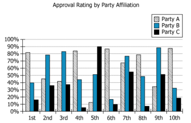 So, researchers asked some people who identify themselves as members of Party A, Party B or Party C. These people were asked to give their approval ratings for the 10 leaders of Nation X.