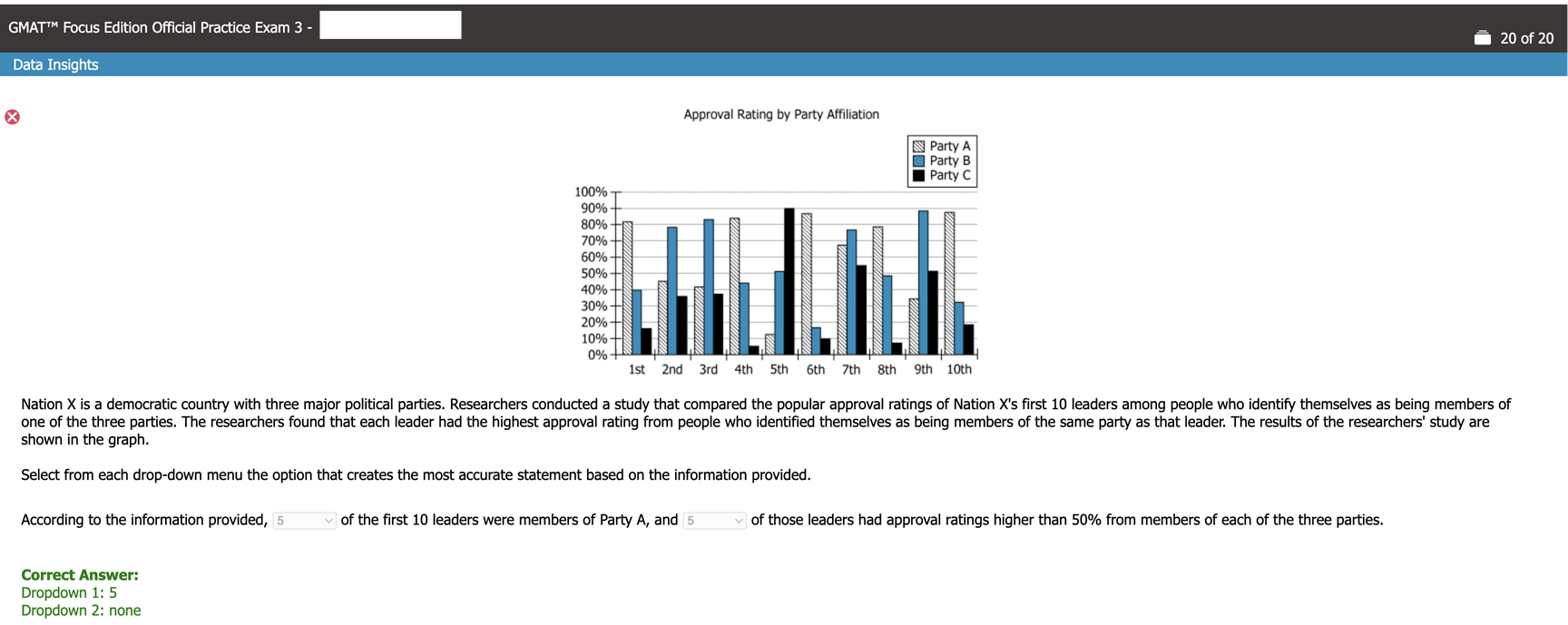Researchers conducted a study that compared the popular approval ratings of Nation X’s first 10 leaders among people who identify themselves as being members of one of the three parties.