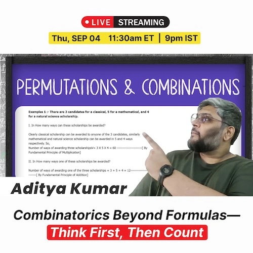 P&C keeps tripping you up? 🤯 Join Aditya Kumar TODAY LIVE for a no-nonsense masterclass on Permutations & Combinations. We’ll make the Permutations vs Combination decision obvious, use visual thinking to simplify setups, and build a fast, test-day-ready approach—without memorizing a forest of formulas.