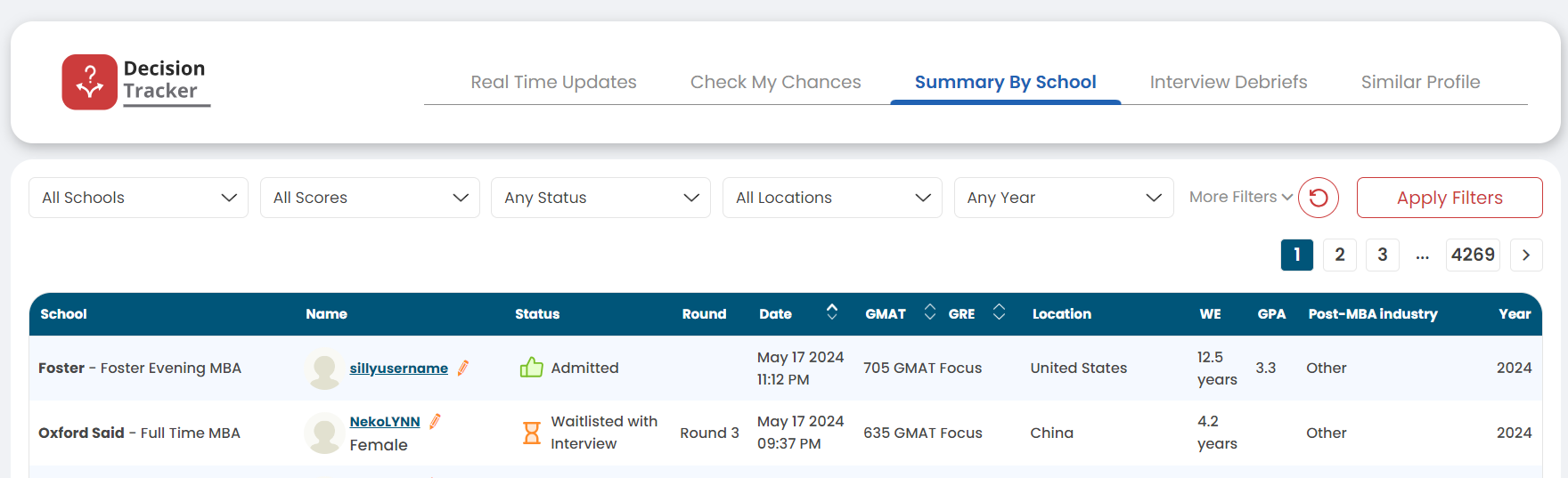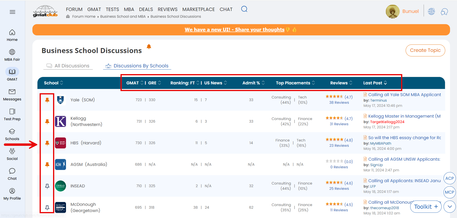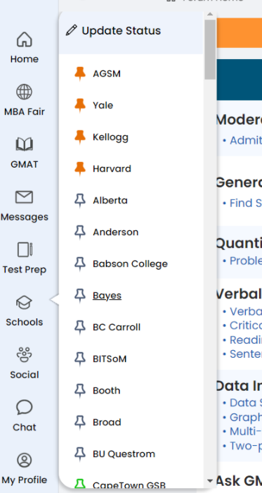 You can now subscribe to a school from that page and pin your favorite schools at the top with the pin icon. We also introduced several sortable columns, such as GMAT and GRE scores by school, Financial Times and US News rankings, and more.