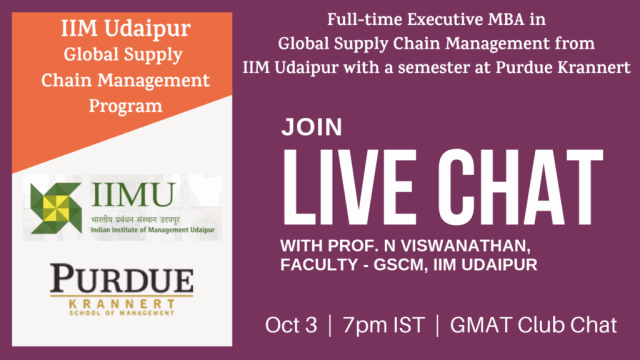 Join Prof. N Viswanathan, Faculty, IIM Udaipur and Rahul Giri, Admissions Assistant, IIMU Admissions for a career-focused online Q&A session. He will be happy to answer your queries about the program; its dual degree component; career prospects in GSCM; placement support; and top hiring companies. Sign up!
