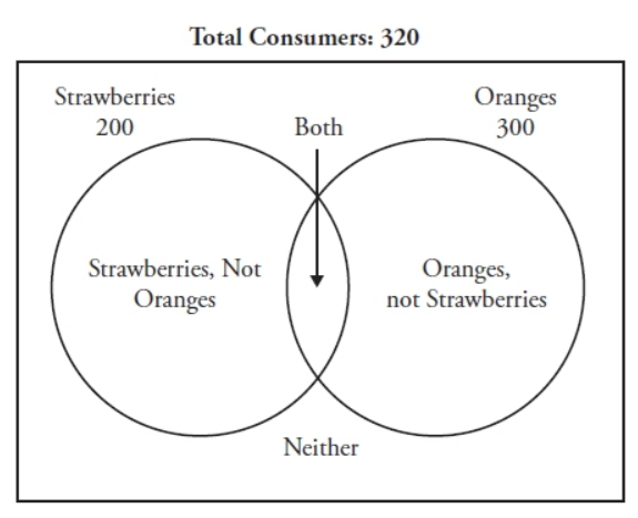 Mathematically, you can use the formula Total = Group 1 + Group 2 - Both + Neither. The complication, however, is that you’re given no information about either the Both or Neither groups. Are there any hidden constraints? At the very least, 300 people must be eating some kind of fruit, because there are 300 people who eat oranges.