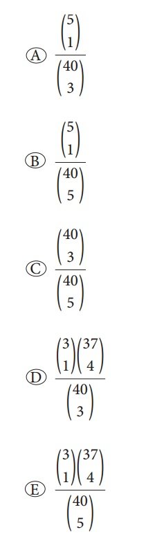 The number of ways 5 specimens can be selected from the 40 specimens is (40 5). To select 5 specimens, only 1 of which has the trait, you have to select 1 of the 3 specimens that have the trait and select 4 of the 37 specimens that do not have the trait. The number of such selections is the product (1 3) (37 4). So the probability that only 1 of the 5 specimens selected will have the trait is represented by (3 1)(37 4 ) (40 5). The correct answer is Choice E.