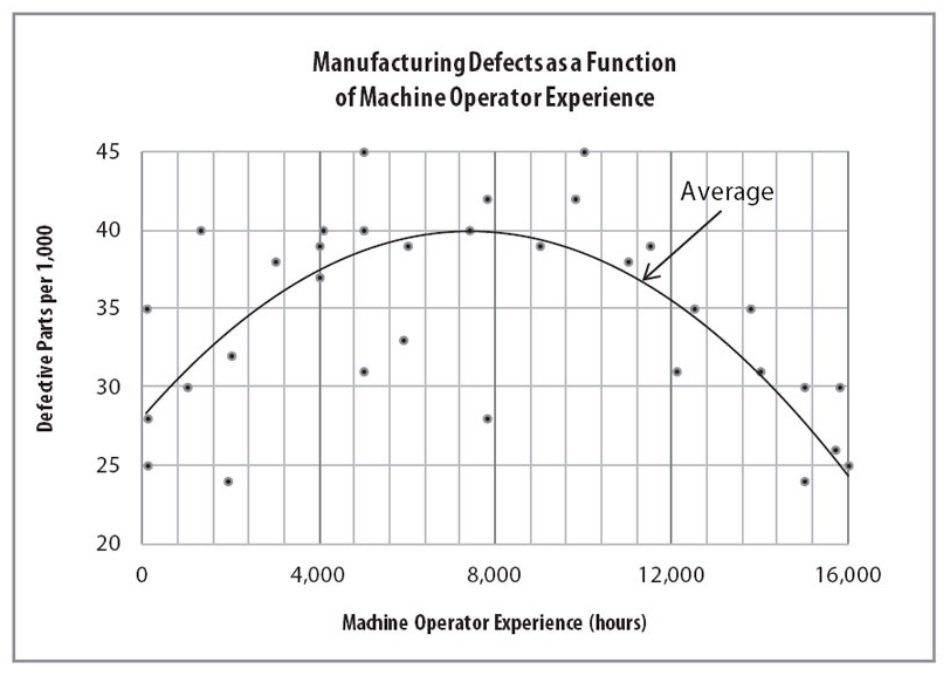 The chart shows defective parts per 1,000 as a function of machine operator experience. The dots indicate individual machine operators, and there is quite a bit of variance by individual. The line labeled “Average” shows the average performance of the group as a whole. A trend emerges: inexperienced machine operators and very experienced machine operators make Fewer mistakes than those with medium level of experience. Also, certain individual machine operators produce defective parts at a lower rate than others with similar levels of experience.