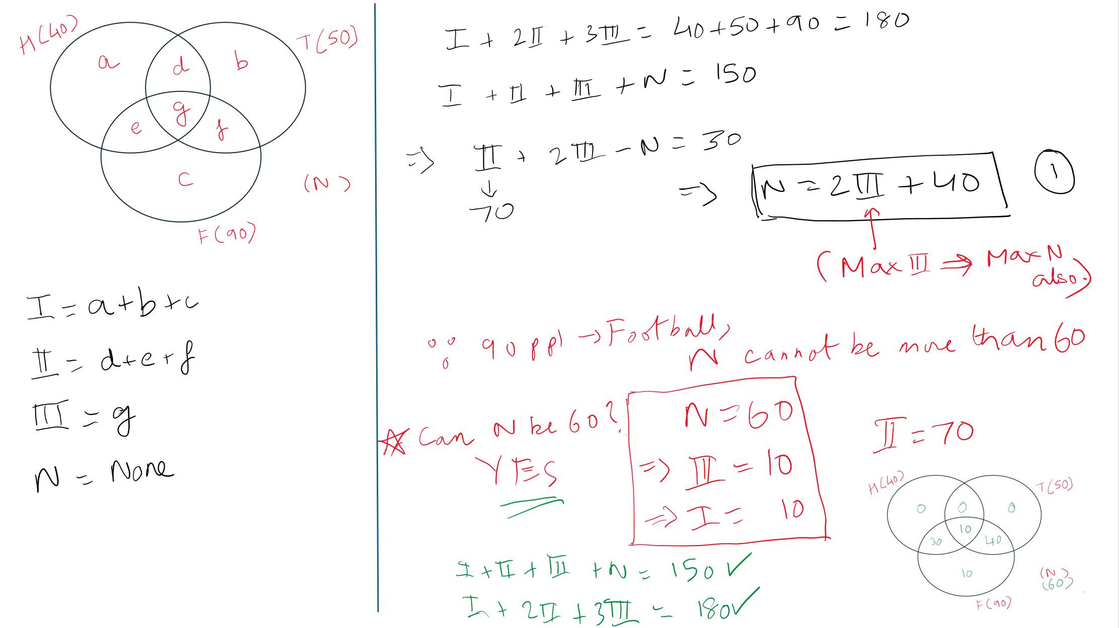 H = Only h + Only h&t + Only h&f + all three = 0 + 0 + Only h&f + 10 = 40........Only h&f = 30