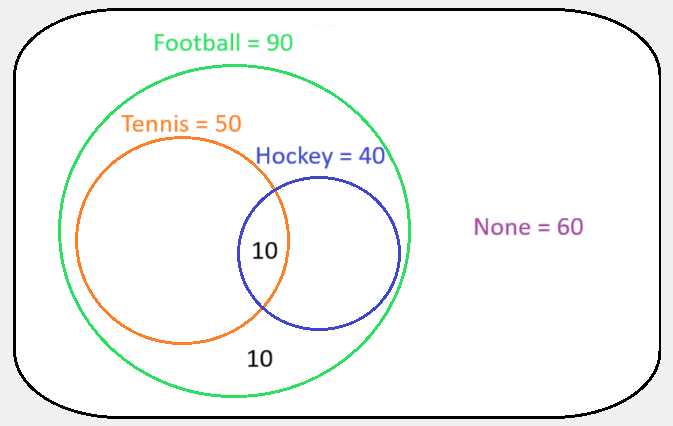 At Rocket Brown Elementary School there are 150 students and three sports teams – hockey, tennis, and football. Rocket Brown students are allowed to participate in as many of the three sports as they like or to abstain from participation completely. At the beginning of the semester, 40 students choose to play hockey, 50 choose to play tennis and 90 choose to play football, while 70 decide to play exactly two sports simultaneously.