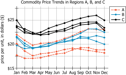 On the assumption that the trends in the graph would continue, someone seeking to sell this commodity at the highest possible price would likely try to sell the commodity in Region ____, in either ____ We need the region and the months of the highest possible price. The Y axis of the graph depict the price of the commodity. The price is highest for Black lines which show the pricing for region C (we can see that in the key) On the black lines, the pricing is highest in the months of October and November. Those points reflect the maximum prices.