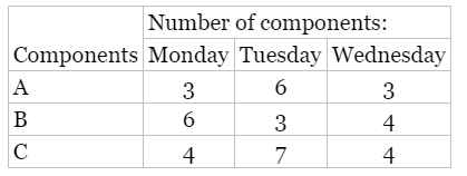 A factory assembles Product X from three components, A, B, and C. One of each component is needed for each Product X and all three components must be available when assembly of each Product X starts. It takes two days to assemble one Product X. Assembly of each Product X starts at the beginning of one day and is finished at the end of the next day. The factory can work on at most five Product Xs at once. If components are available each day as shown in the table above, what is the largest number of Product Xs that can be assembled during the three days covered by the table?