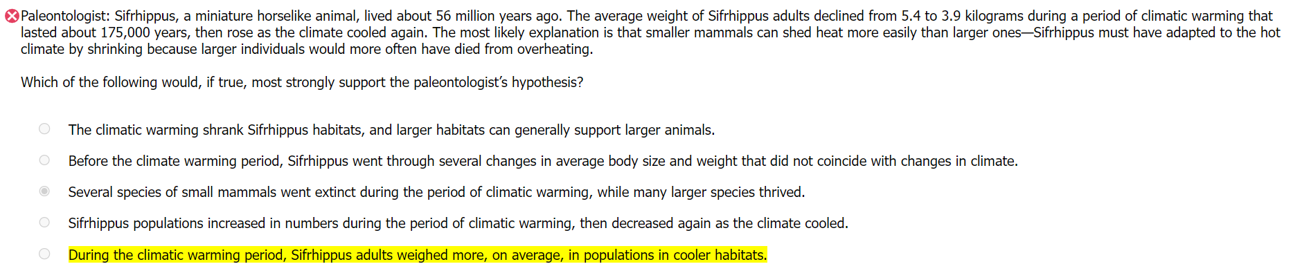 By showing that the relationship between size and climate held even within one time period, this choice helps to eliminate other variables that could have changed over time and thus confirm that the key factor causing Sifrhippus to be smaller or larger was Sifrhippus's adaptation to different temperatures.
