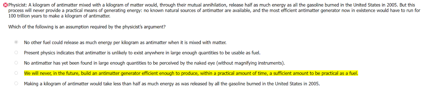 Hence, within the confines of this argument alone, this statement is not the required assumption to conclude from the premise that there is no feasible way to find or source antimatter, that the process is not practical.