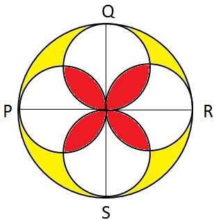 PR and QS are perpendicular diameters of a large circle with centre O, while PO, QO, RO and SO are diameters of four identical smaller circles, as shown above. What is the ratio of the yellow shaded region to the area of the red shaded region?