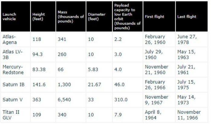 | The Saturn V has the greatest height-to-mass ratio of the launch vehicles used in Projects Mercury, Gemini, and Apollo. | ||