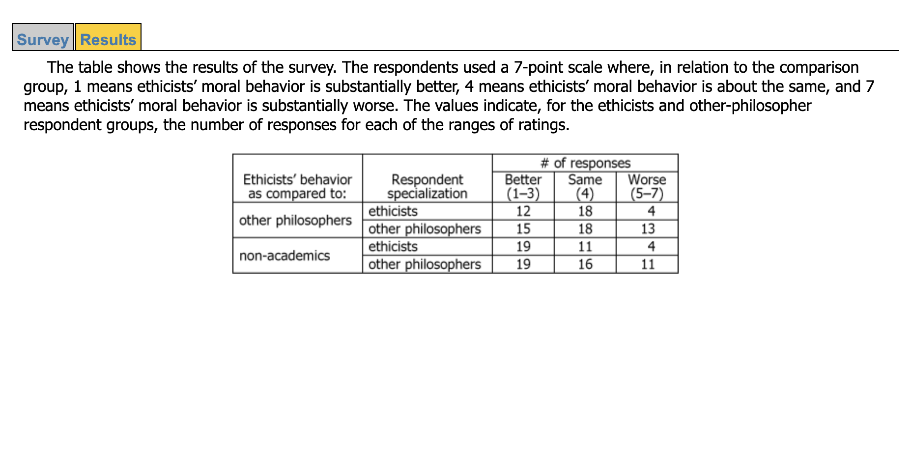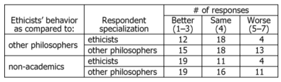 | They were more likely to report better moral behavior by ethicists relative to the comparison groups than they were to report worse moral behavior. |