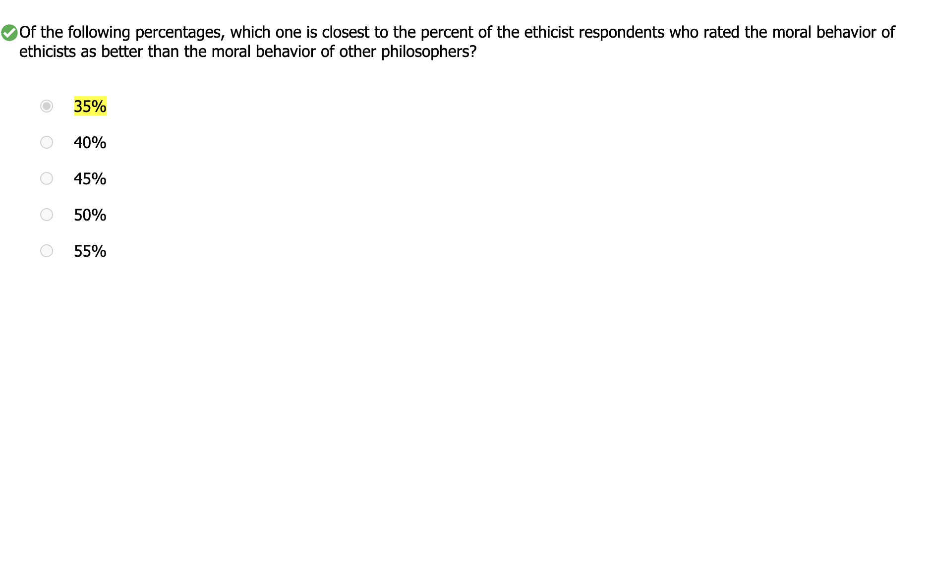 | A majority reported that ethicists’ moral behavior was about the same as that of other philosophers. | ||