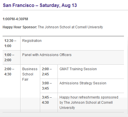 A great event for all those applying this year to meet schools, hear application advice, and check out your competition!Find the right MBA program for you with seminars, meet-and-greets, and admissions advice.- Engage with schools one-on-one in an open networking session—over 30 top schools (see the full list below)