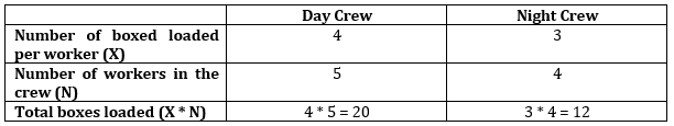 [notice that we have intentionally assumed the number of box loaded and number of day crew workers as 4 and 5, to avoid any fractional calculation. Both the numbers could have been assumed as 1 or any other number – the end result would have been same, but may lead to fractional calculations]