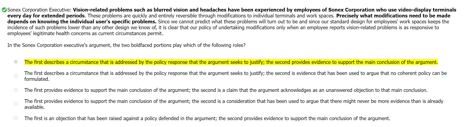 In the Sonex Corporation executive’s argument, the two boldfaced portions play which of the following roles?