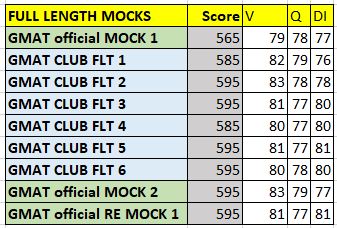 GMAT first timer Prep. Scoring around 595 in official mocks and 6 Full length Mocks of GMAT CLUB with 2.5 months of prep.
