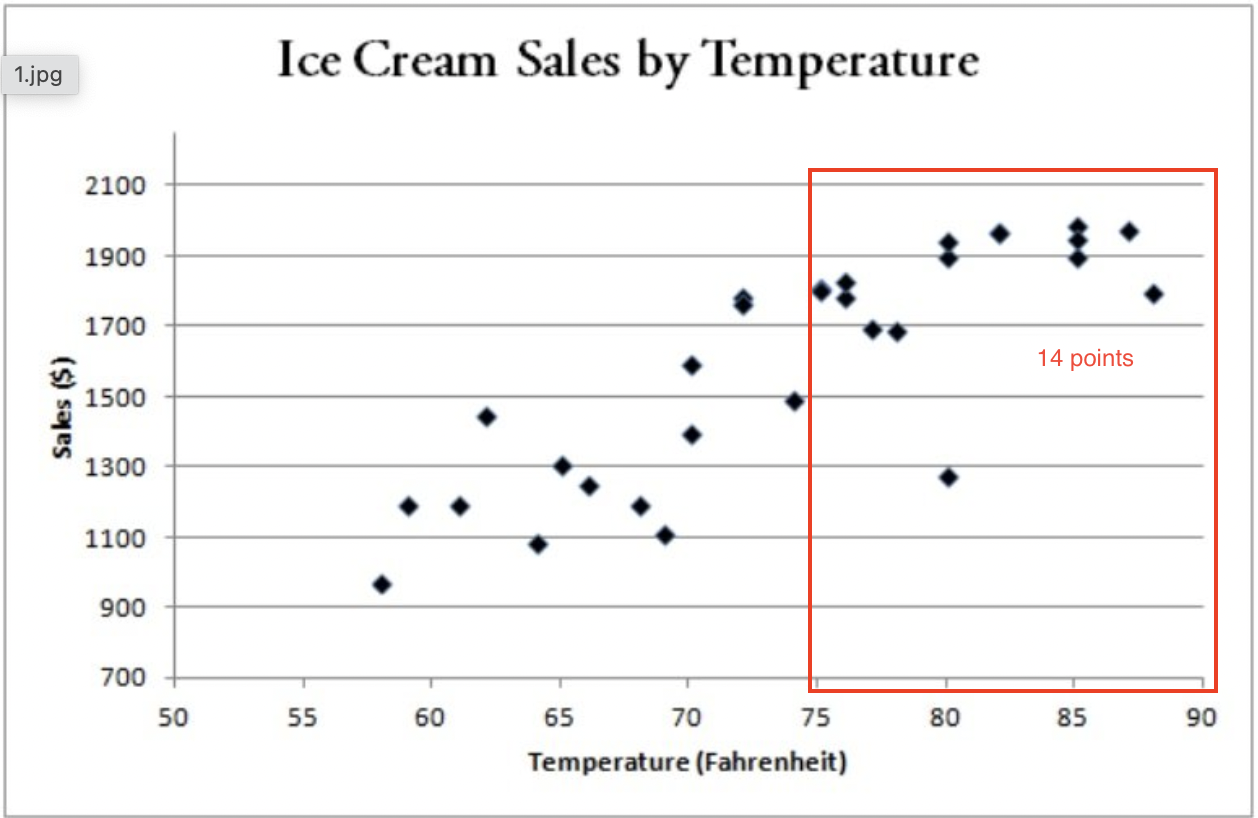The question asks whether more/less/equal half of the shop's sales revenue came on days when the high temperature was greater than 75 degrees. you don't need to make any calculation here too. there are about the same (it doesnt matter it is EXACTLY the same) amount of sales on the left of 75F and on the right of 75F. Given that there is a very positive trend, higher avg temperature => higher avg Sales. Since "avg revenue = # sales * avg sale price", the