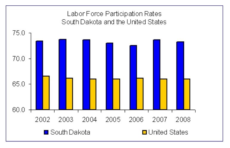 | For the years 2002 through 2008, South Dakota had a higher labor force participation rate than did the United States. |