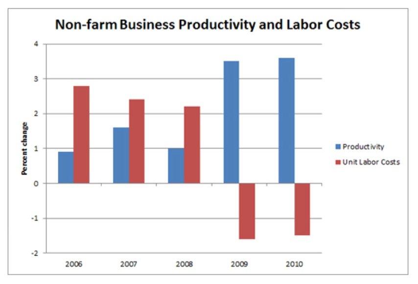 The attached graph shows the year-over-year percent change in productivity and unit labor cost as measured by the Bureau of Labor Statistics across five years. Using the graph, please answer the questions that follow.