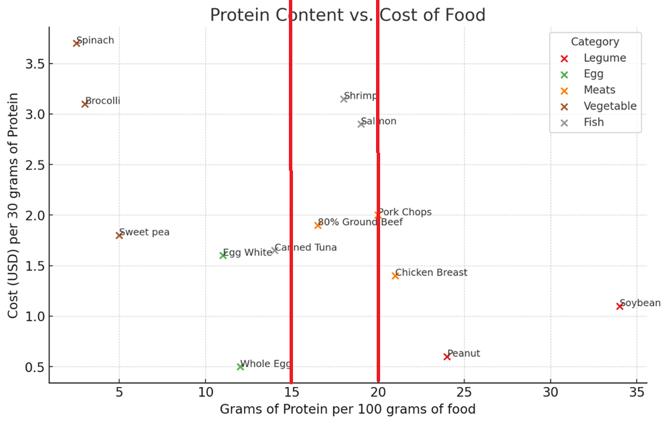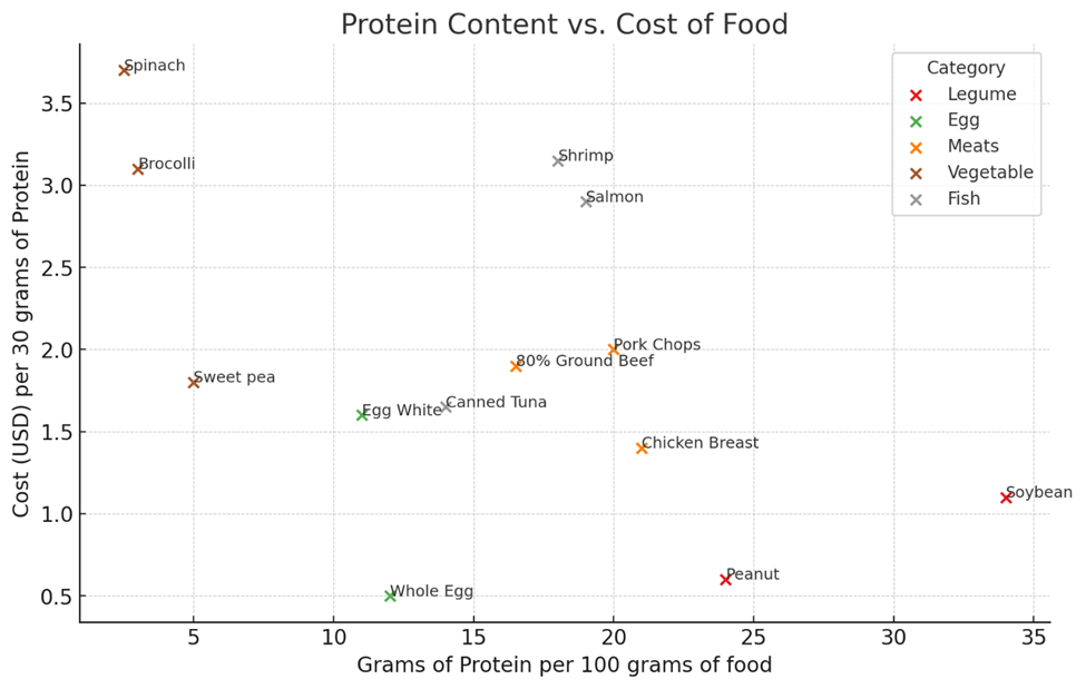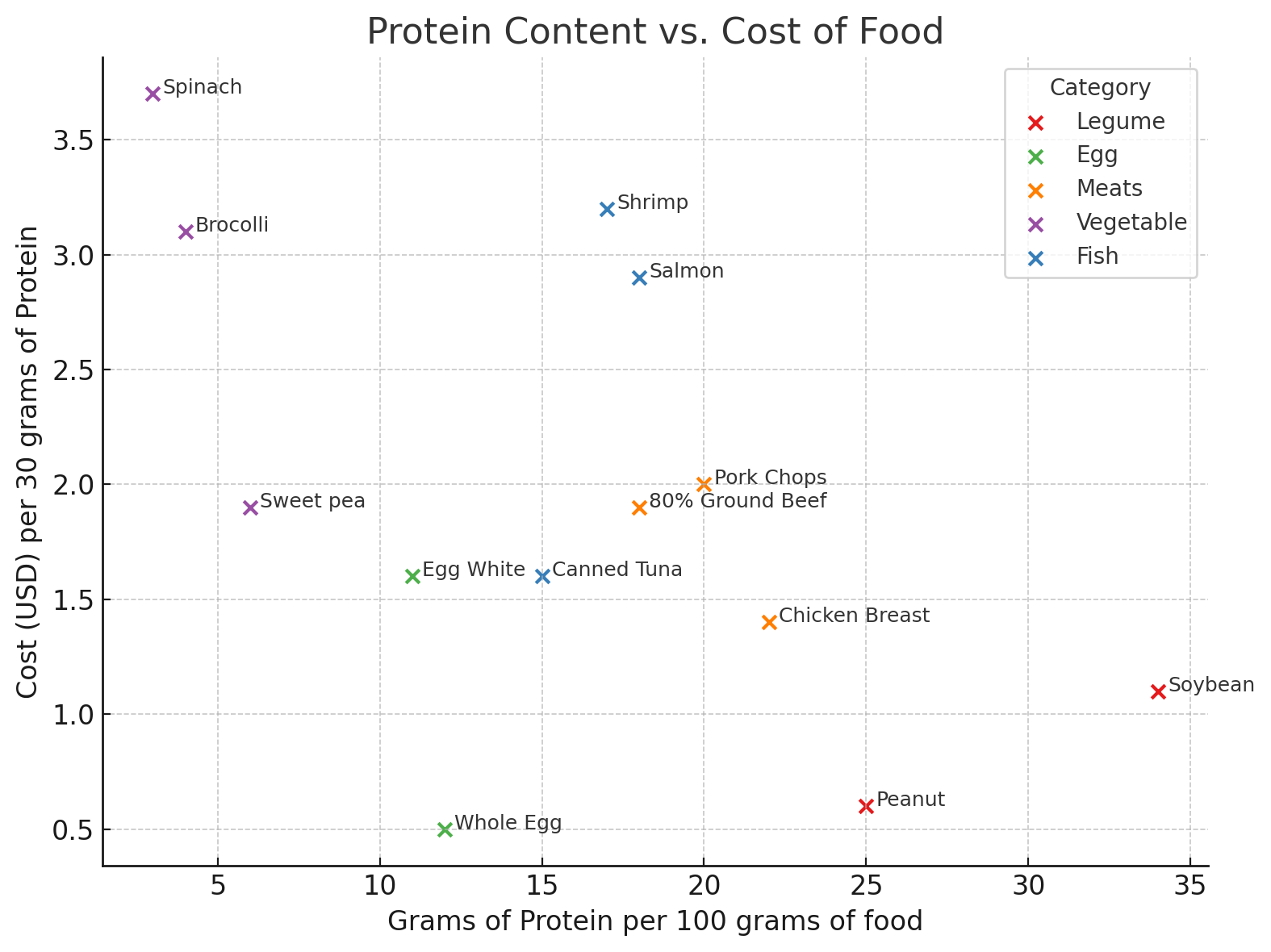 The chart above shows the relationship between grams of protein per 100 grams of food and the cost (USD) per 30 grams of protein for various food items. The data points are labeled with the food name, and the color represents the food category of each item.