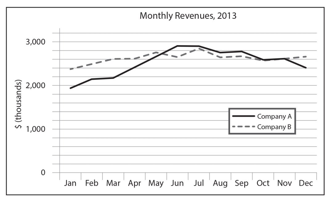 In 2013, Company A’s annual revenues were___________Company B’s annual revenues and__________the positive difference between the two figures was approximately.