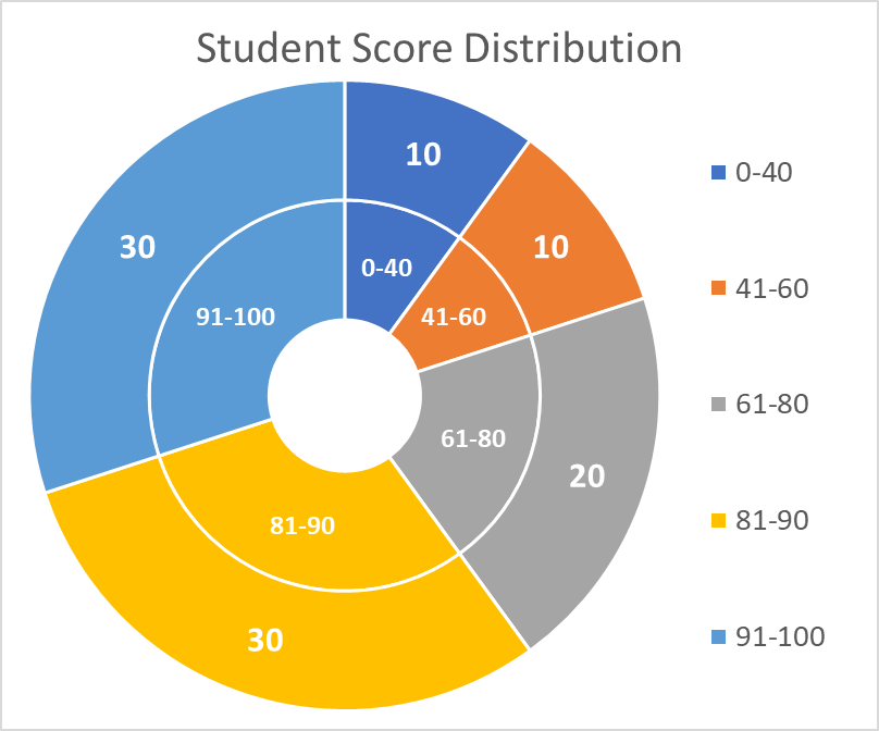 ­The sunburst graph gives the scores of a class consisting of 100 students. The inner circle gives the range of marks and the outer circle gives the number of students who have scored within that range. The score for each student was an integer.Step 1: Read the graph, restate what information it’s trying to present