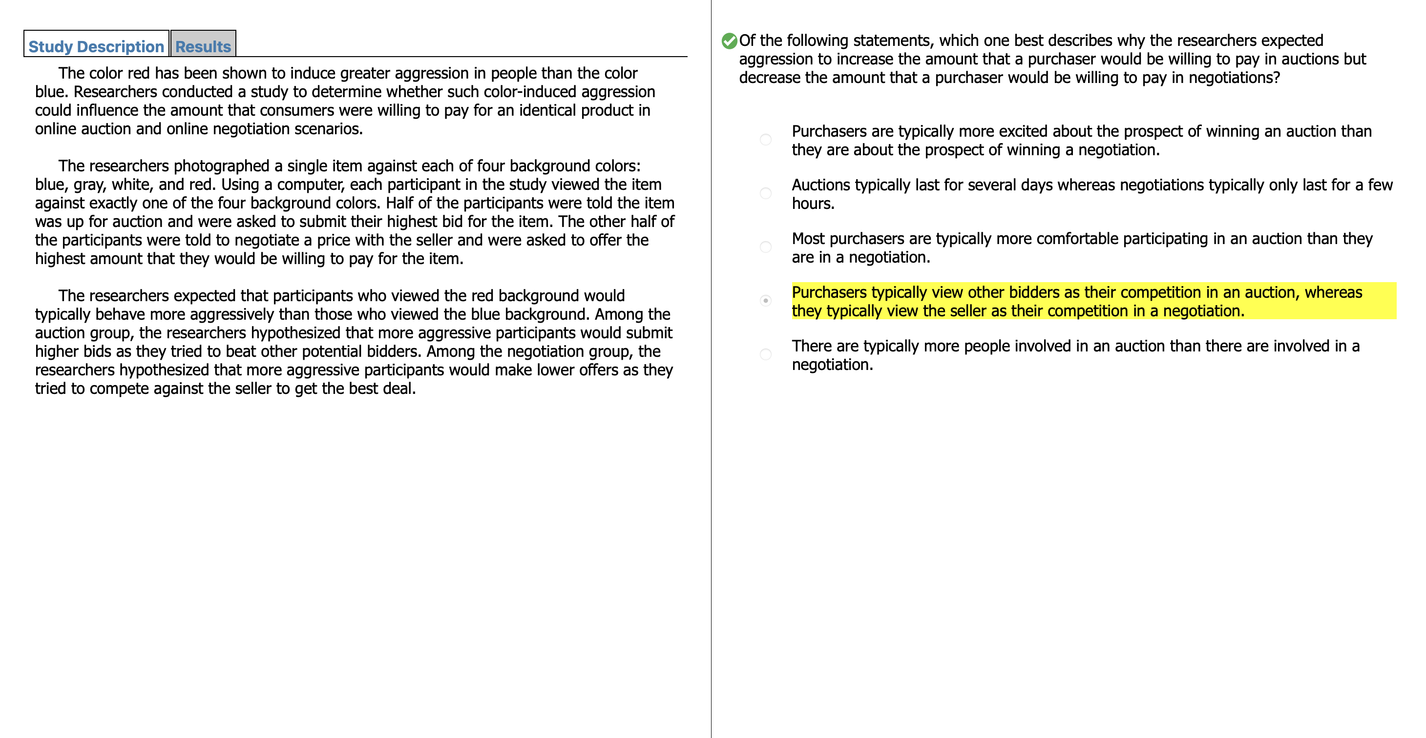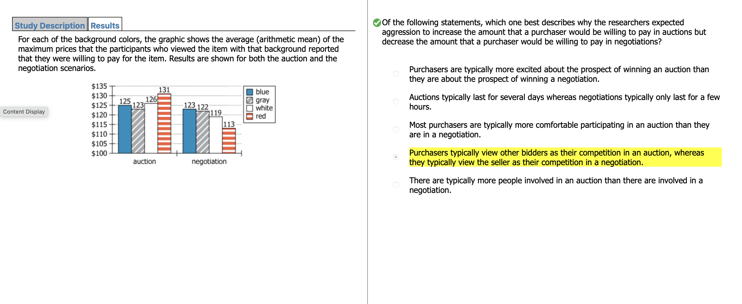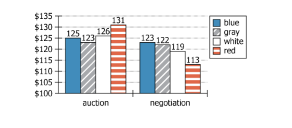 | For each of the background colors, the average maximum price was greater in the auction scenario than it was in the negotiation scenario. |