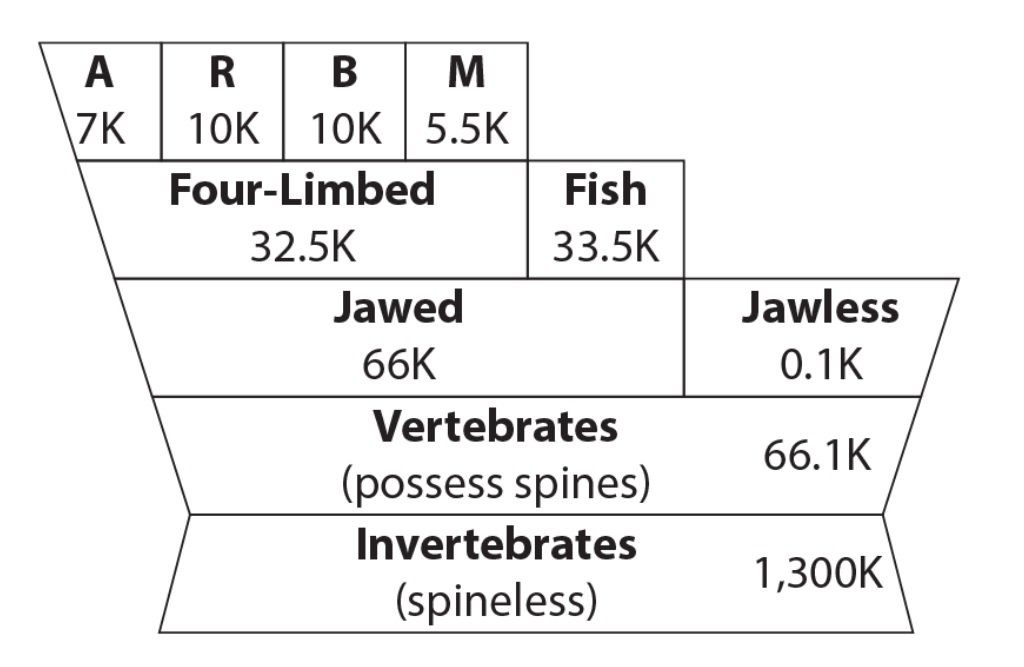 The blurb further explains that the boxes above the V box represent subcategories of V and that the numbers represent the number (in thousands) of species. Glance at the diagram again. V’s are split into the categories Jawed or Jawless. Total, there are 66K V’s, most of which are jawed. Only a very small number are jawless. The jawed vertebrates can then be broken down into the categories Four-Limbed or Fish, and there are roughly equal numbers of each. Finally, the Four-Limbed group can be broken into four subgroups whose names appear only in the blurb: amphibians, reptiles, birds, and mammals. Reptiles and birds are the largest categories and mammals are the smallest category.