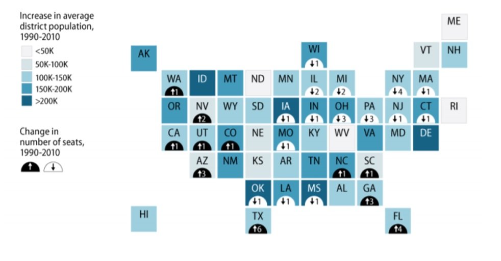 The figure shows changes in state district size and changes in the number of House seats allocated to each state between the 1990 and 2010 apportionments. Twelve U.S. House seats shifted across states following the 2010 census; 10 states lost seats and 8 states gained seats, distributed as shown.
