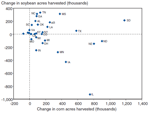 The range of change in combined corn and soybean acreage among the states during the period shown in the graph was approximately times the largest increase in soybean acreage of any state during the same period.