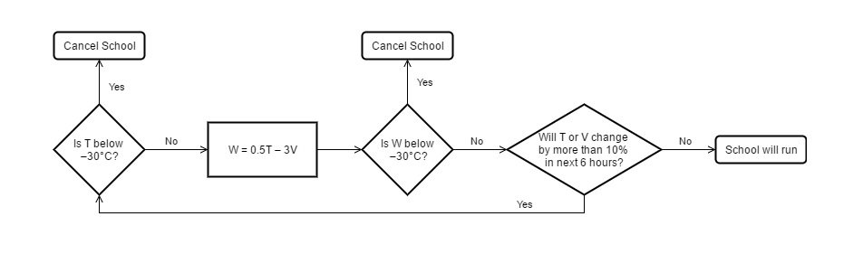 The flowchart shows the process by which a certain county determines whether to cancel school due to adverse weather conditions. If the air temperature (T), in degrees Celsius, is below a certain value, school will be canceled. If the air temperature by itself does not trigger cancellation, then a calculation of wind chill (W) is performed; this formula is dependent upon the air temperature and the wind speed (V). Finally, if air temperature or wind speed are expected to change by more than 10% within a 6-hour period, the calculations are repeated with the forecast values for T and V.